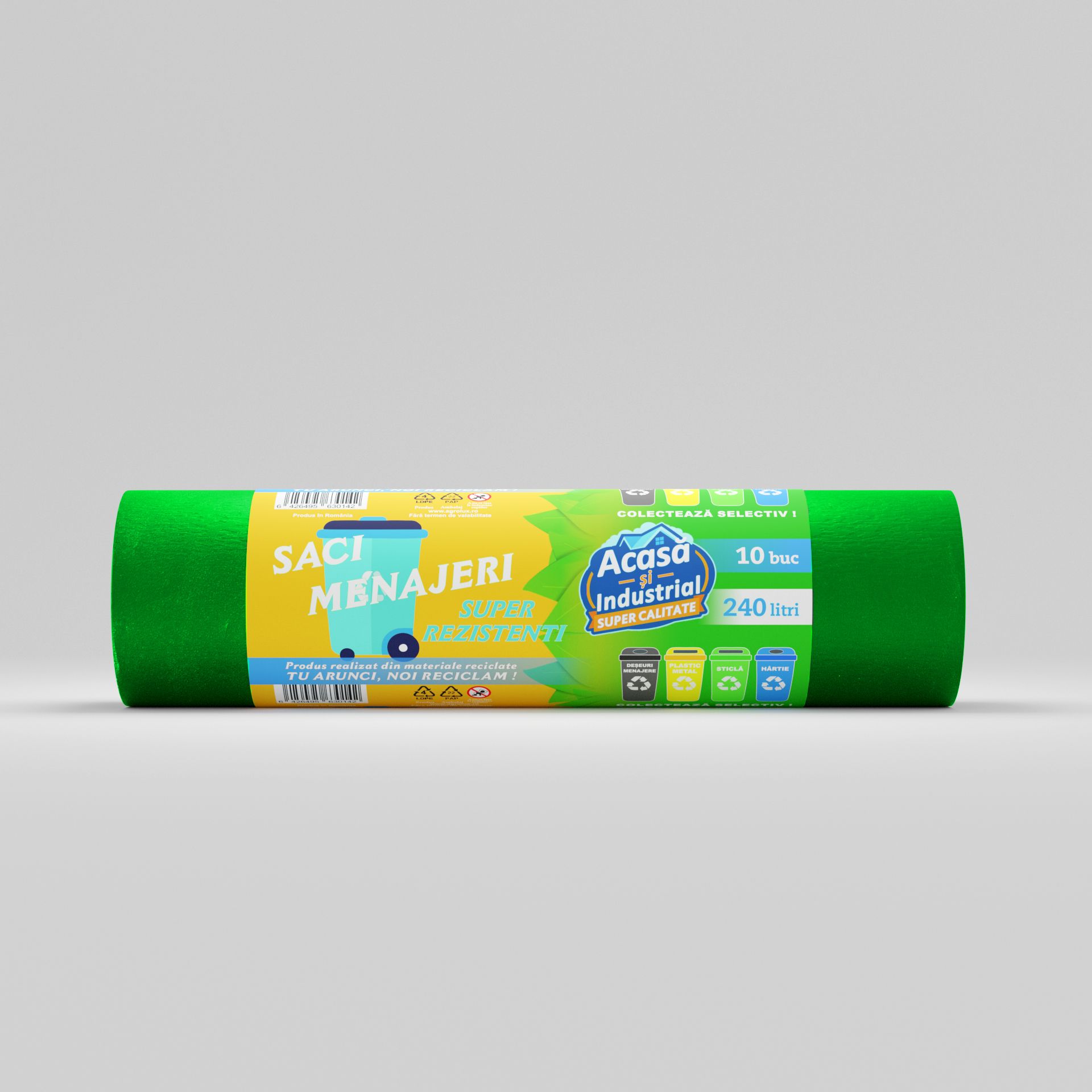 Sacii menajeri de 240L oferă o soluție excelentă pentru gestionarea eficientă a volumelor mari de deșeuri, fiind disponibili în pachete practice de 10 saci per rolă. Aceștia sunt realizați din material LDPE de înaltă calitate, având o rezistență superioară și o capacitate ridicată, ideale pentru diverse aplicații atât casnice, cât și industriale.